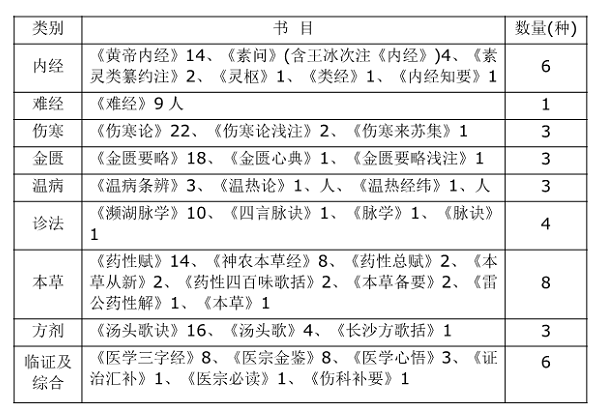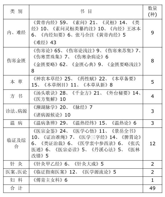 其中,被20人以上提及的书有12种:(1)《伤寒论》65人,(2)《金匮要略》62人,(3)《黄帝内经》60人,(4)《难经》43人,(5)《温病条辨》29人,(6)《汤头歌诀》28人,(7)《神农本草经》25人,(8)《医宗金鉴》24人,(9)《药性赋》22人,(10)《素问》21人,(11)《千金方》21人,(12)《濒湖脉学》20人。